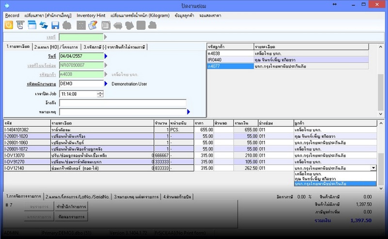 การปิดงานซ่อม เมื่องานซ่อมเสร็จสิ้น การปดงานซ่อมจะเป็นการสรุปค่าใช้จ่ายทั้งหมดใน Job และเป็นการล๊อคงานซ่อมไม่ให้มีการแก้ไข ค่าอะไหล่ หรือค่าแรง ค่าใช้จ่ายใด ๆ แล้วเพื่อสรุปค่าใช้จ่ายกับลูกค้า แต่ค่าใช้จ่ายทั้งหมดอาจจะมีผู้ร่วมรับค่าใช้จ่ายมากกว่า 1 คน เช่น บางส่วนลูกค้าจ่าย บางส่วนบริษัทประกันภัยจ่าย บางส่วนทางบริษัทฯ รับไว้เอง ในการปิดงานซ่อมก็สามารถแบ่ง ค่าใช้จ่ายออกให้แต่ละคนได้ ซึ่งสามารถใบปิดงานซ่อมเป็นของแต่ละคนได้ ![]() การรับชำระงานซ่อม หลังจากปิดงานซ่อมการรับชำระสามารถทำรับชำระผ่านระบบการเงินของโปรแกรม รับชำระจากเอกสารปิดงานซ่อม รองรับการรับชำระทั้งเงินสด เช็ค(หลายใบก็ได้) บัตรเครดิต(หลายใบก็ได้) หรือเงินโอนธนาคารก็ได้ และหากเป็นลูกค้าเครดิต ก็สามารถโอนเอกสารปิดงานซ่อมเป็นงานซ่อมค้างชำระรอเรียกเก็บภายหลังได้ หรือเอกสารปิดงานซ่อมอาจจะทำโอนตัดเป็น ค่าใช้จ่ายขององค์กรก็ได้ (เช่นกรณีซ่อมรถของตัวเอง) ![]() |