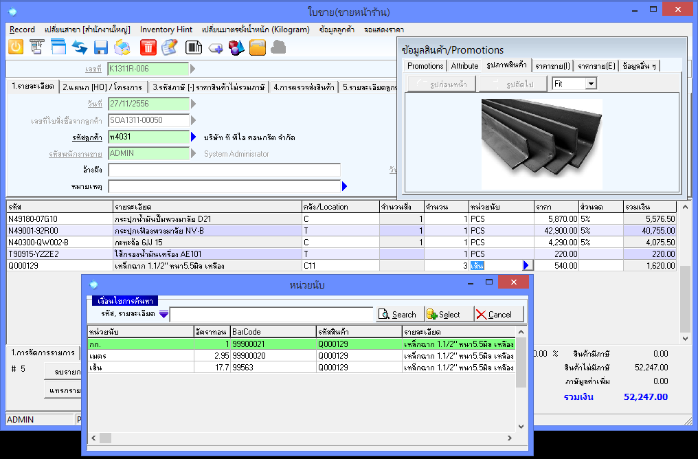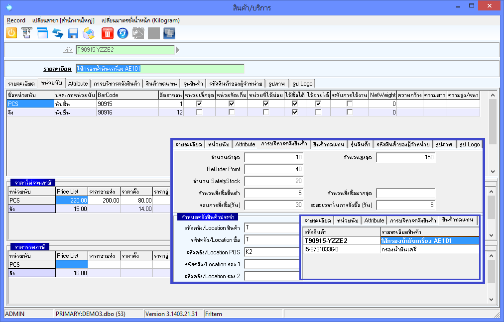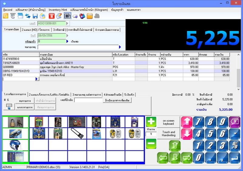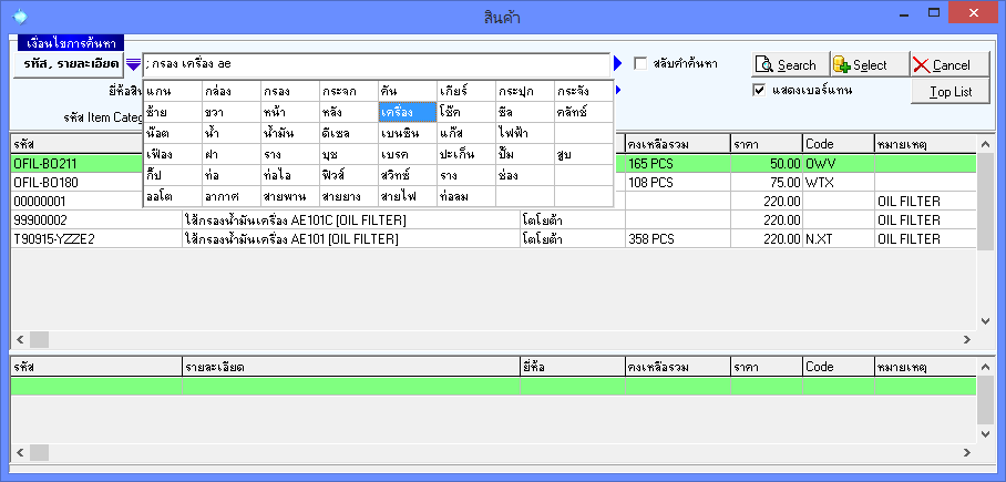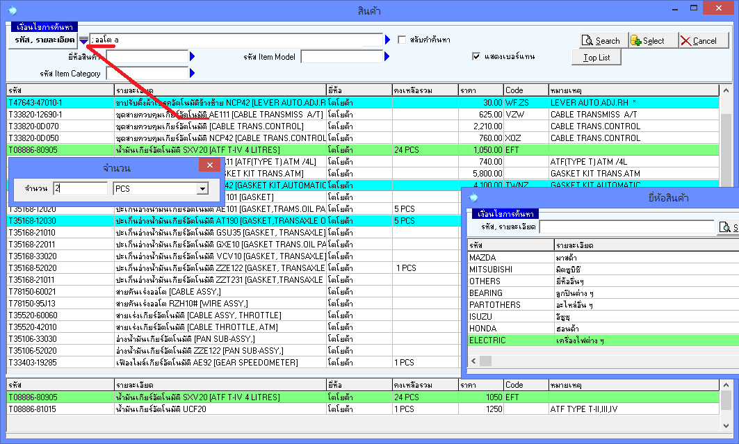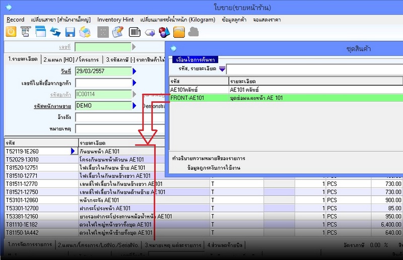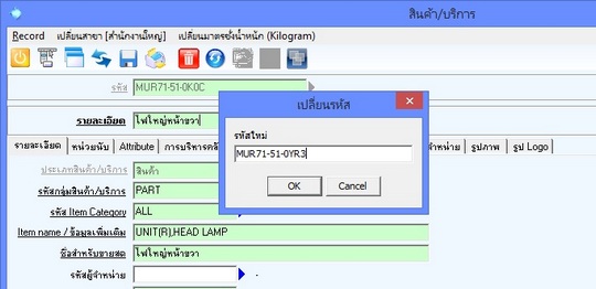การค้นหาสินค้า สินค้าในระบบจำนวนมาก หากไม่สามารถค้นหาสิ่งที่ลูกค้าต้องการได้ เท่ากับระบบล้มเหลวในทันที เพราะไม่สามารถเปิดบิลได้ นอกจากนี้การค้นหาโปรแกรมสามารถทำได้ใช้เงื่อนไขได้หลายอย่าง การค้นหาด้วยข้อความสั้น ๆ ประกอบกัน การระบุยี่ห้อสินค้าช่วยค้นหา และสิ่งที่เกิดปัญหาบ่อย ๆ คือ คีย์ค้นหาด้วยคำว่า ออโต แต่ไม่พบข้อมูลเพราะในฐานข้อมูลบันทึกด้วยคำว่า อัตโนมัติ - การแสดงเบอร์แทนกรณีสินค้าหมด หรือราคาสูงไปสำหรับลูกค้า - การระบุสินค้าที่ต้องการทีละหลาย ๆ รายการโดยไม่ต้องเปิด-ปิดหน้าต่างค้นหาหลายครั้ง ทั้งหมดเพื่อให้การค้นหาสินค้าทำได้ง่ายที่สุด เร็วที่สุด และหาได้พบ ![]() การเพิ่มความรวดเร็วในการคีย์ข้อความค้นหา เนื่องจากหลาย ๆ คำสะกดยาก หรือไม่มีความชำนาญในการใช้คีย์บอร์ด ก็สามารถเรียกใช้ตารางคำที่ใช้บ่อย ๆ มาประกอบกันเพื่อค้นหาสินค้า ![]() หากยังไม่สามารถค้นหาได้ โปรแกรมยังมีระบบการค้นหาสินค้าด้วยแผนผังรูป ![]() ฐานข้อมูลสินค้า ศูนย์กลางของระบบสินค้าคงคลังก็คือ ฐานข้อมูลสินค้า เป็นที่รวบรวมรายละเอียดของสินค้า เพื่อนำไปใช้ประโยชน์ ในงานต่าง ๆ ของโปรแกรม และเพื่อตอบสนองความหลากหลายของสินค้า สินค้าของโปรแกรมจึงมีได้หลายหน่วยนับ แต่ละหน่วยนับก็คนละราคา การบริหารจุดสั่งซื้อ ตำแหน่งเก็บสินค้า เบอร์แทนของสินค้า อะไหล่ใช้กับสินค้ารุ่นใดได้บ้าง การจัดกลุ่มจัดหมวดหมู่ของสินค้า เพื่อการวิเคราะห์ข้อมูล ฐานข้อมูลสินค้าจึงเปรียบเสมือนคลังความรู้เกียวกับสินค้า ที่ถูกถ่ายทอดลงในโปรแกรม ![]() การบันทึกภาพสินค้า ส่วนประกอบข้อมูลสินค้าที่มีประโยชน์มาก แต่มักทำได้ยาก โปรแกรมจึงมีวิธีการบันทึกภาพสินค้าการ Load รูปภาพมาใส่แบบเดิม หรือการคัดลอกรูปภาพจากโปรแกรมดูรูป หรือจาก Web Browser และที่สำคัญด้วยวิธีการที่ง่ายกว่า คือการถ่ายภาพด้วยกล้อง Web Camera ที่ติดอยู่กับเครื่องคอมพิวเตอร์ เพียงหันกล้องไปยังตัวสินค้า แล้วสั่ง Capture โปรแกรมก็ทำการบันทึกภาพเข้าโปรแกรมได้ทันที ไม่ต้อง Load จากกล้องมาลง Disk ก่อน แล้วจึงเรียกมาจับคู่กับสินค้า และโปรแกมยังสามารถบันทึกรูปสินค้าแต่ละสินค้าได้หลายรูป ง่ายกว่า เร็วกว่า สะดวกกว่า ![]() การแก้ไขรหัสสินค้า เมื่อระบบทำงานไปซักระยะหนึ่ง มักจะเกิดความคิดในการปรับปรุงคุณภาพข้อมูล สิ่งหนึ่งที่เกิดขึ้นบ่อยคือ ความต้องการเปลี่ยนรหัสสินค้า โปรแกรมสามารถสั่งแก้ไขรหัสสินค้าได้ แม้ว่าสินค้านั้นจะมีการเรียกใช้งานไปแล้ว ![]() การจัดชุด Package สินค้า สินค้าบางอย่างซื้อมาเป็นข้างซ้าย ข้าง