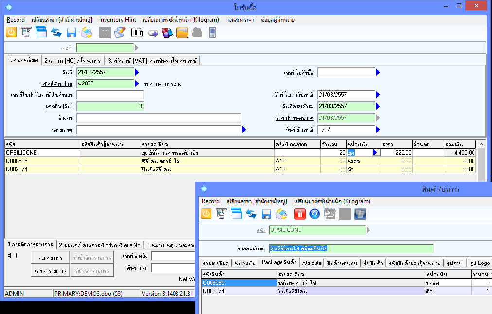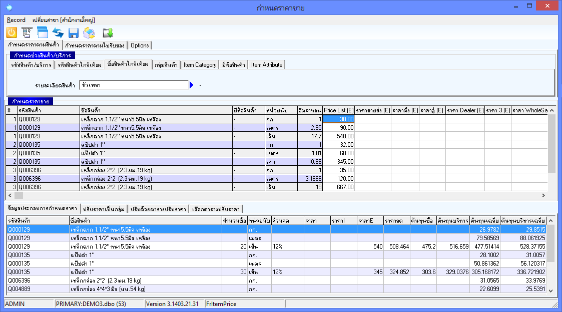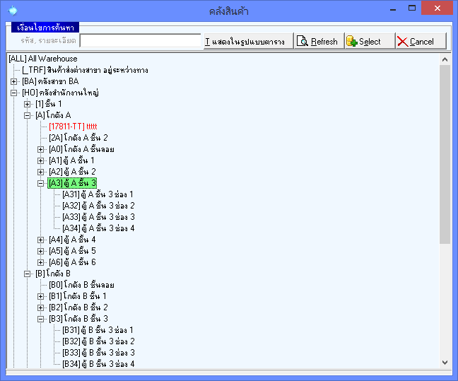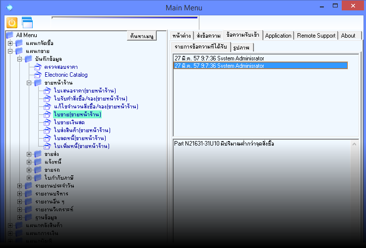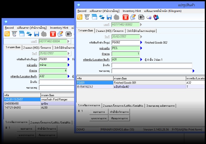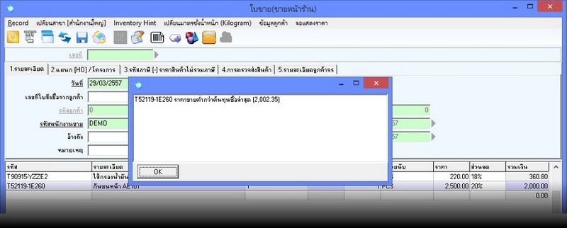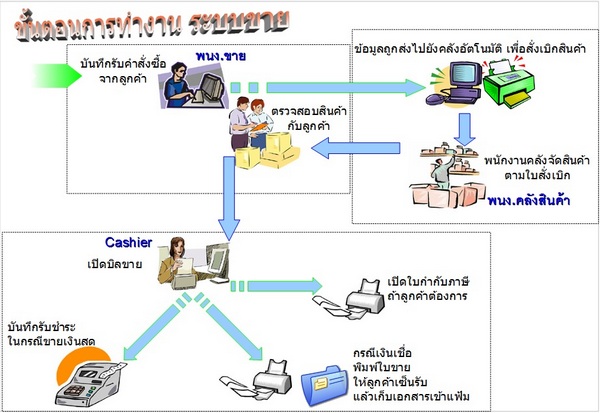 การค้นหาสินค้า สินค้าในระบบจำนวนมาก หากไม่สามารถค้นหาสิ่งที่ลูกค้าต้องการได้ เท่ากับระบบล้มเหลวในทันที เพราะไม่สามารถเปิดบิลได้ นอกจากนี้การค้นหาโปรแกรมสามารถทำได้ใช้เงื่อนไขได้หลายอย่าง การค้นหาด้วยข้อความสั้น ๆ ประกอบกัน การระบุยี่ห้อสินค้าช่วยค้นหา และสิ่งที่เกิดปัญหาบ่อย ๆ คือ คีย์ค้นหาด้วยคำว่า ออโต แต่ไม่พบข้อมูลเพราะในฐานข้อมูลบันทึกด้วยคำว่า อัตโนมัติ - การแสดงเบอร์แทนกรณีสินค้าหมด หรือราคาสูงไปสำหรับลูกค้า - การระบุสินค้าที่ต้องการทีละหลาย ๆ รายการโดยไม่ต้องเปิด-ปิดหน้าต่างค้นหาหลายครั้ง ทั้งหมดเพื่อให้การค้นหาสินค้าทำได้ง่ายที่สุด เร็วที่สุด และหาได้พบ ![]() การเพิ่มความรวดเร็วในการคีย์ข้อความค้นหา เนื่องจากหลาย ๆ คำสะกดยาก หรือไม่มีความชำนาญในการใช้คีย์บอร์ด ก็สามารถเรียกใช้ตารางคำที่ใช้บ่อย ๆ มาประกอบกันเพื่อค้นหาสินค้า ![]() หากยังไม่สามารถค้นหาได้ โปรแกรมยังมีระบบการค้นหาสินค้าด้วยแผนผังรูป ![]() ฐานข้อมูลสินค้า ศูนย์กลางของระบบสินค้าคงคลังก็คือ ฐานข้อมูลสินค้า เป็นที่รวบรวมรายละเอียดของสินค้า เพื่อนำไปใช้ประโยชน์ ในงานต่าง ๆ ของโปรแกรม และเพื่อตอบสนองความหลากหลายของสินค้า สินค้าของโปรแกรมจึงมีได้หลายหน่วยนับ แต่ละหน่วยนับก็คนละราคา การบริหารจุดสั่งซื้อ ตำแหน่งเก็บสินค้า เบอร์แทนของสินค้า อะไหล่ใช้กับสินค้ารุ่นใดได้บ้าง การจัดกลุ่มจัดหมวดหมู่ของสินค้า เพื่อการวิเคราะห์ข้อมูล ฐานข้อมูลสินค้าจึงเปรียบเสมือนคลังความรู้เกียวกับสินค้า ที่ถูกถ่ายทอดลงในโปรแกรม ![]() การบันทึกภาพสินค้า ส่วนประกอบข้อมูลสินค้าที่มีประโยชน์มาก แต่มักทำได้ยาก โปรแกรมจึงมีวิธีการบันทึกภาพสินค้าการ Load รูปภาพมาใส่แบบเดิม หรือการคัดลอกรูปภาพจากโปรแกรมดูรูป หรือจาก Web Browser และที่สำคัญด้วยวิธีการที่ง่ายกว่า คือการถ่ายภาพด้วยกล้อง Web Camera ที่ติดอยู่กับเครื่องคอมพิวเตอร์ เพียงหันกล้องไปยังตัวสินค้า แล้วสั่ง Capture โปรแกรมก็ทำการบันทึกภาพเข้าโปรแกรมได้ทันที ไม่ต้อง Load จากกล้องมาลง Disk ก่อน แล้วจึงเรียกมาจับคู่กับสินค้า และโปรแกมยังสามารถบันทึกรูปสินค้าแต่ละสินค้าได้หลายรูป ง่ายกว่า เร็วกว่า สะดวกกว่า ![]() การแก้ไขรหัสสินค้า เมื่อระบบทำงานไปซักระยะหนึ่ง มักจะเกิดความคิดในการปรับปรุงคุณภาพข้อมูล สิ่งหนึ่งที่เกิดขึ้นบ่อยคือ ความต้องการเปลี่ยนรหัสสินค้า โปรแกรมสามารถสั่งแก้ไขรหัสสินค้าได้ แม้ว่าสินค้านั้นจะมีการเรียกใช้งานไปแล้ว ![]() การจัดชุด Package สินค้า สินค้าบางอย่างซื้อมาเป็นข้างซ้าย ข้าง