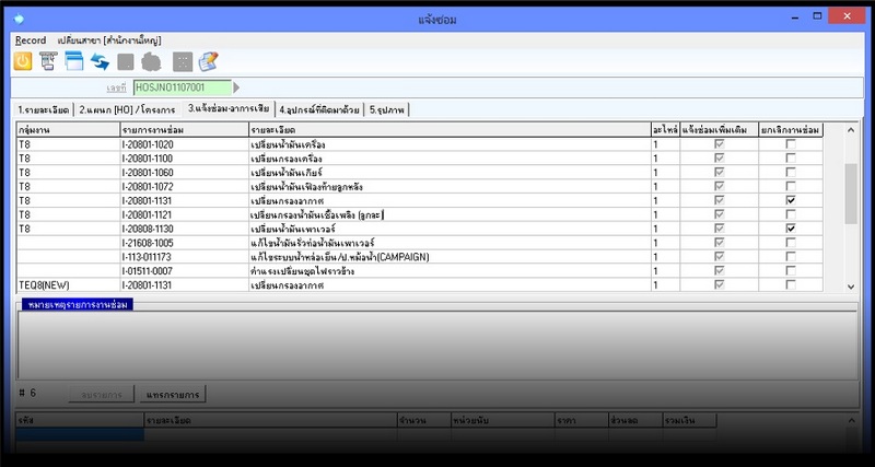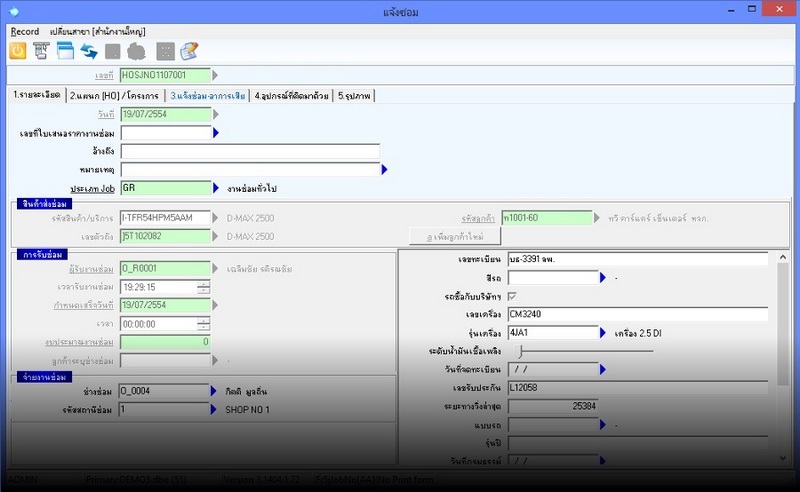 การรับงานซ่อม โปรแกรมสามารถเก็บข้อมูลเกี่ยวกับรถ หรือสินค้าที่นำเข้าซ่อมบำรุง ได้ละเอียดกว่า การแบ่งกลุ่มงานซ่อม การกำหนด ช่างซ่อม สถานีงานซ่อม นัดหมายเวลารับคืน รวมทั้งการบันทึกภาพสินค้าไว้ก่อนขณะรับงานซ่อม เพื่อยืนยันรอยตำหนิต่าง ๆ จะไม่ได้ไม่มีปัญหาภายหลัง หรือใช้ในการบันทึกภาพความบกพร่อง ความเสียหายเพื่อใช้ประกอบการทำงานได้ ![]() การระบุรายละเอียดงานซ่อมบำรุง สามารถกำหนดรายการงานซ่อมมาตรฐานไว้ล่วงหน้าได้ ซึ่งจะเป็นงานซ่อมบำรุง ที่ทำประจำ และสามารถนำมาจัดรวมกลุ่มเป็นกลุ่มงานซ่อมไว้ได้เพื่อความรวดเร็วในการรับงานซ่อม รวมถึงสามารถเพิ่มเติม งานซ่อม หรือยกเลิกงานซ่อมบางงานได้ หลังจากงานซ่อมเริ่มแล้ว เช่นการแจ้งลูกค้าถึงความเสียหายต่อเนื่องที่พบระหว่าง การซ่อม หรือลูกค้าแจ้งขอยกเลิกงานซ่อมภายหลัง ![]() |